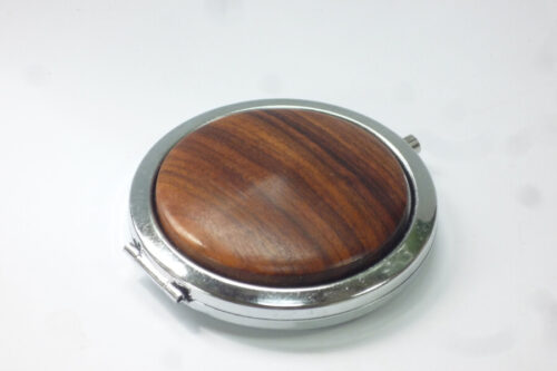 Compact mirrors with decorative wooden tops inset, snap shut clasps and 2 mirrors inside, one magnifying. Comes with a neat, free drawstring velvet black bag. See individual descriptions. Each compact is different, unique and beautifully finished with beeswax polish to let the natural colour of the wood shine through. A great wooden gift or present and arrives gift ready and cute addition to anyone’s handbag.
