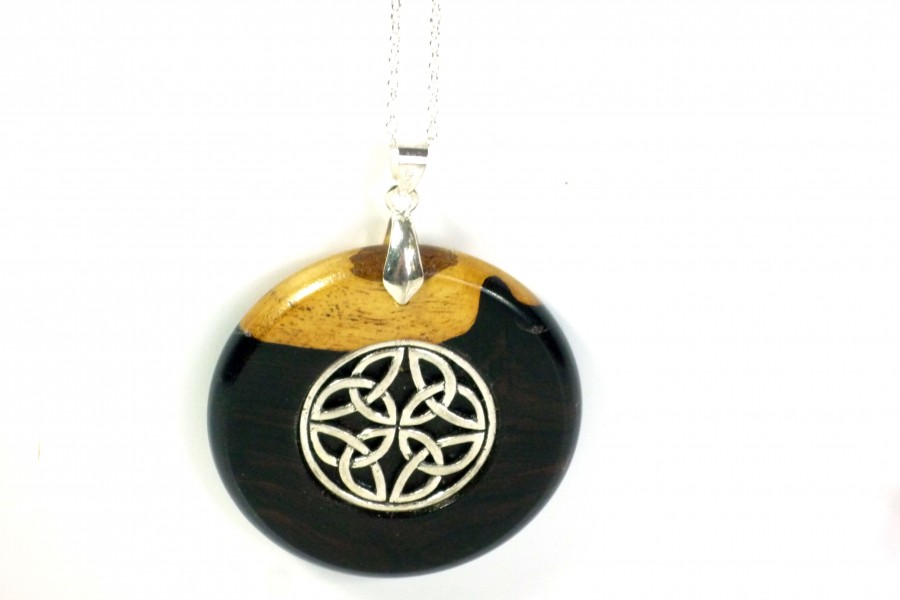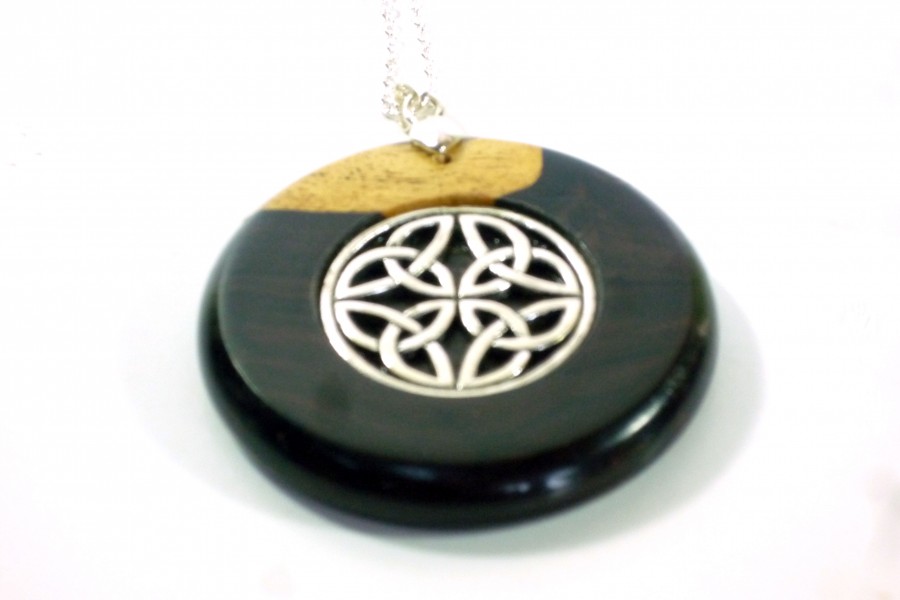 A pendant or necklace in African Blackwood with Tibetan silver Celtic knot inlaid on a long silver plated chain with magnetic clasp.